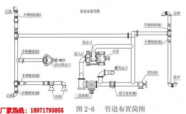 在洒水和浇灌花木时,其操作程序是:调节三通球阀G到如图位置(注意:三通球阀凹坑所对方向关闭),关闭铝合金球阀H和消防栓I,打开不锈钢球阀A、B、C、D、E,打开铝合金球阀H,踏下离合,打开取力器开关,慢慢松开离合(千万不可过快,否则将会损坏取力器或变速箱),使水泵开始工作,即可向实现洒水和浇灌花木的功能,停止工作后开关回位。