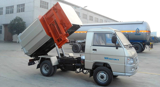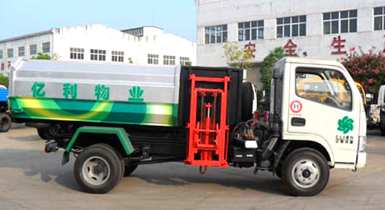 装料:装料前开启驾驶室仪表盘上的厢盖电气开关打开货厢厢盖。然后到车的右侧操作装载手柄提升垃圾桶装料。操作完成后脱开取力器。